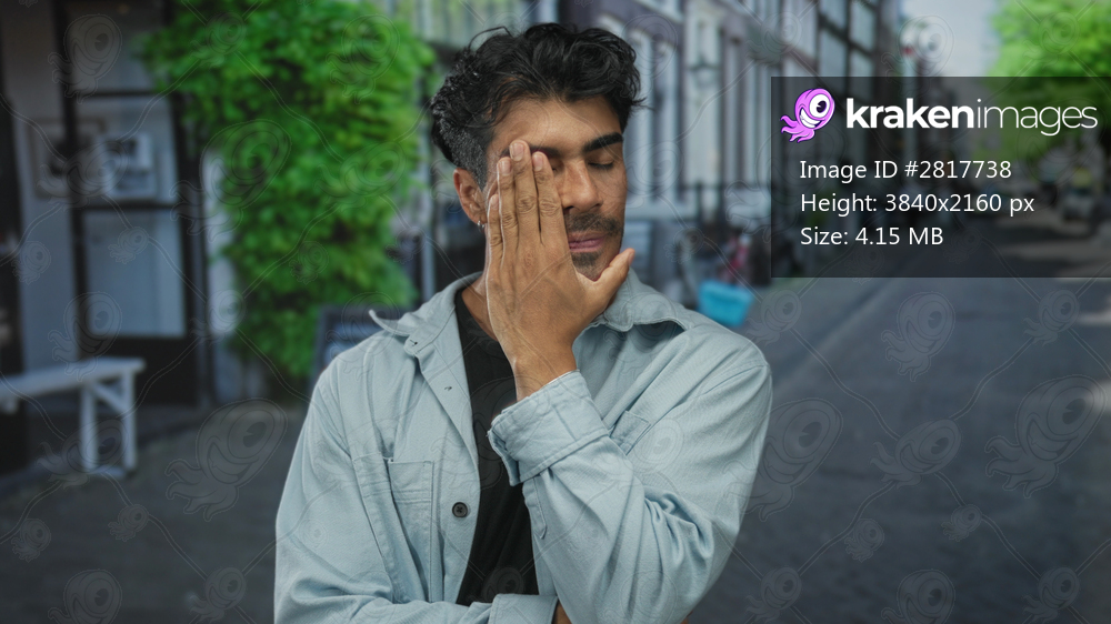 Man holds cheek with both hands on city street outside a row of buildings while pressing face in discomfort; pain.