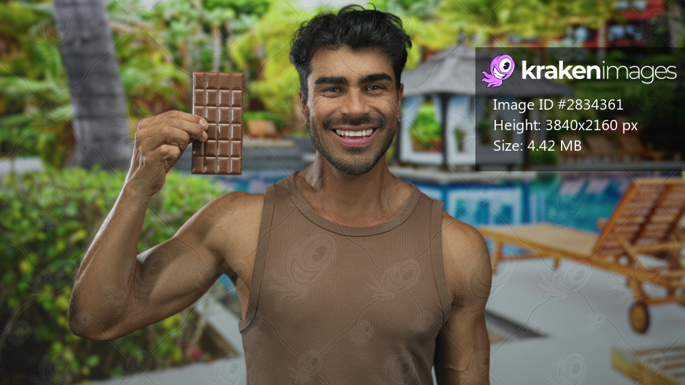 Man holds chocolate bar by tanned bare arm at sunlit resort pool deck with a bright smile; contentment.