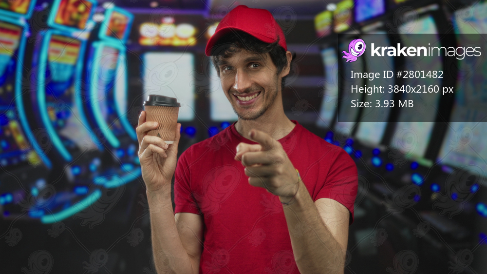 Man holds coffee cup and points finger by slot machines in casino while winking; playful invitation.
