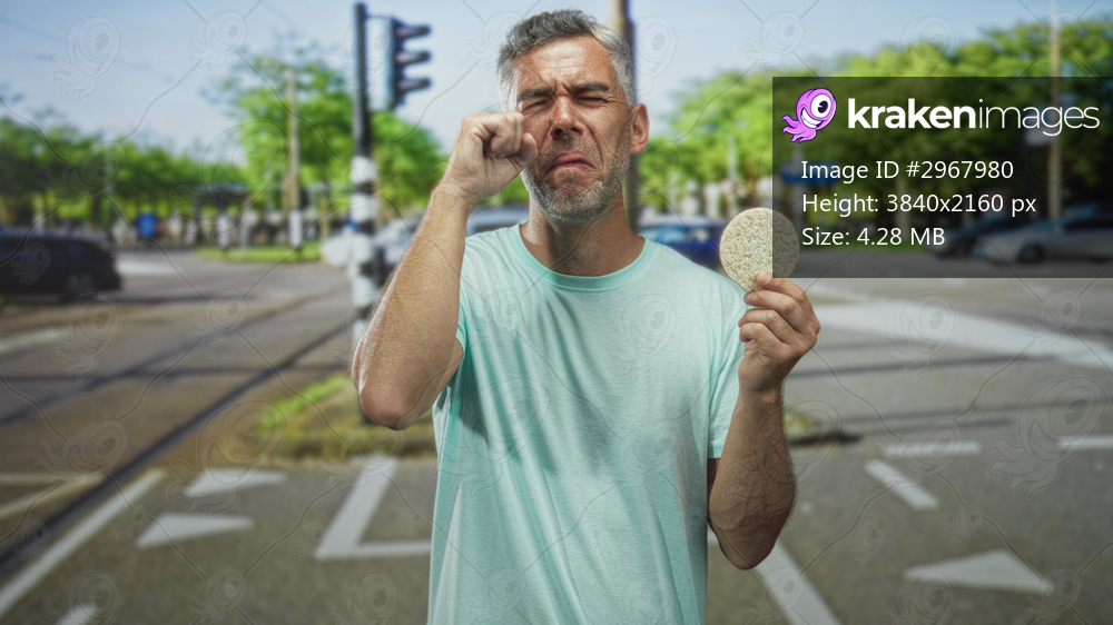 Man holds corn pastry and pinches nose while grimacing and wiping eye on a busy street intersection with traffic lights and crosswalk; disgust.