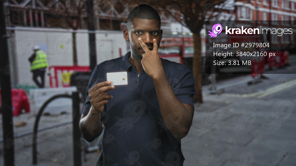Man holds creditcard in one hand and makes a v finger gesture to his face while also pointing in other frames on a street; confidence trust.