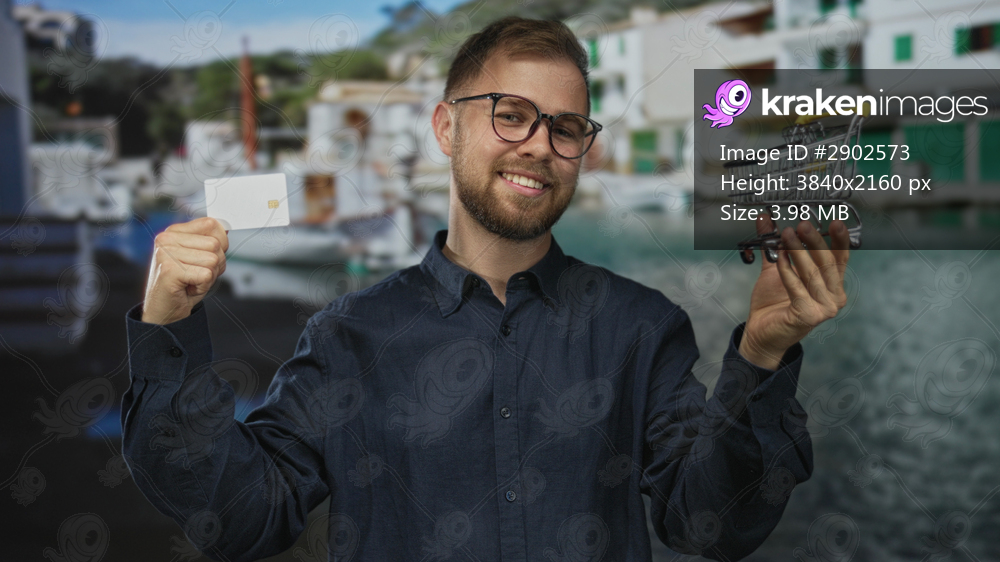 Man holds creditcard and miniature shopping cart at port by boats and dock, smiling and presenting both; digital payment convenience optimism.