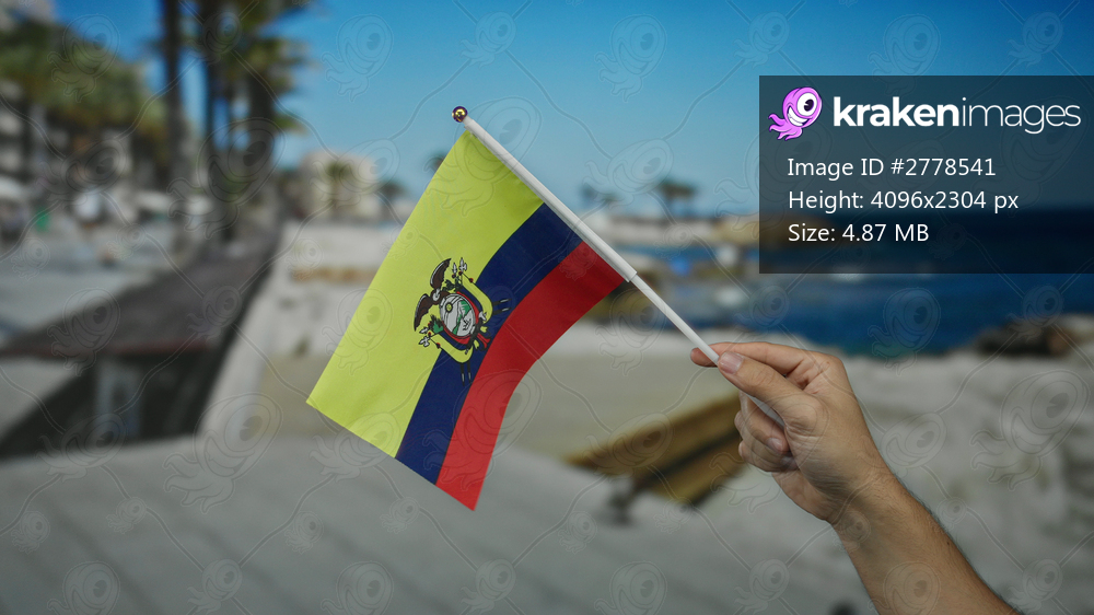 Man holds ecuadorian flag at seaside beach showcasing patriotism against scenic outdoor backdrop.