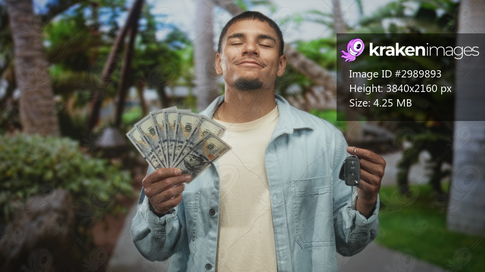 Man holds fanned dollars in one hand and car keys in the other on a palm lined street; confidence success.