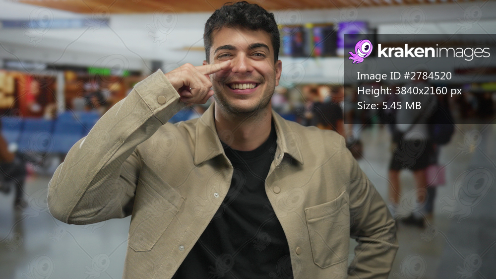 Man holds finger near nose then touches it inside airport lounge as a hispanic young guy stands beside pointing to terminal board with a gentle smile.