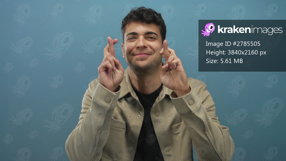 Man holds fingers crossing background while male hispanic young colored backdrop guy hopes.