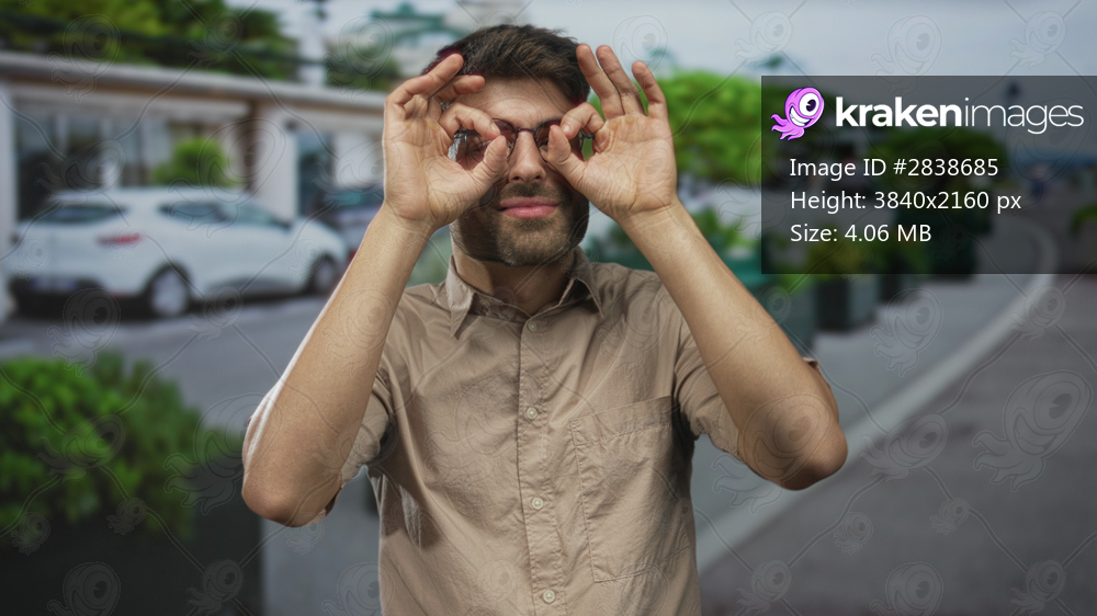 Man holds fingers in circle before eyes in hand binoculars gesture on urban street lined with potted plants and parked cars; curiosity.
