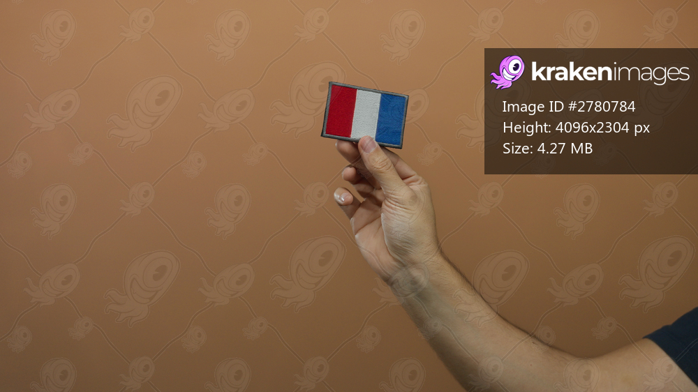 Man holds french flag embroidery against a brown wall, showcasing patriotism and craftsmanship with his hand prominently featured against the isolated background. - Kraken Images
