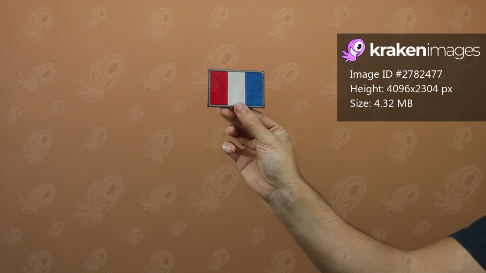 Man holds french flag embroidery against a brown wall, showcasing patriotism and craftsmanship with his hand prominently featured against the isolated background. - Kraken Images