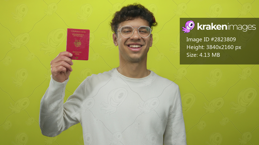 Man holds german passport in green studio set showing visa document with his raised hand against green backdrop; pride.