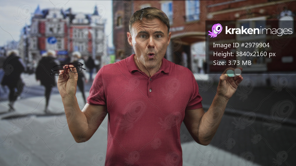 Man holds glasses in one hand and a contact lens case in the other on a street; comparison choice curiosity.