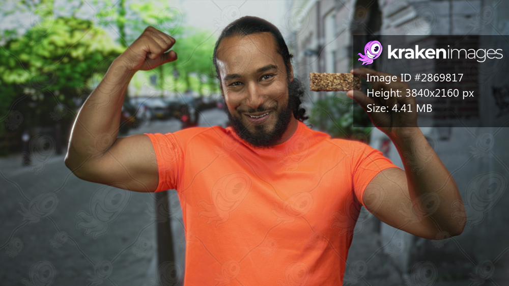 Man holds granola bar and flexes bicep in street wearing orange shirt and ponytail while smiling; confidence healthy energy.