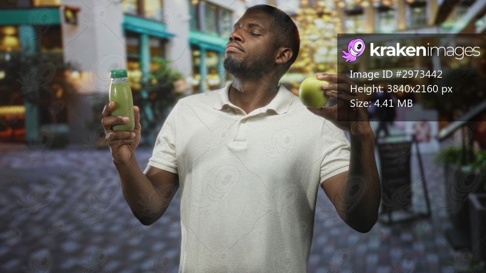 Man holds green juice bottle in left hand and green apple in right hand while comparing choices on a street market; healthy choice hesitation.