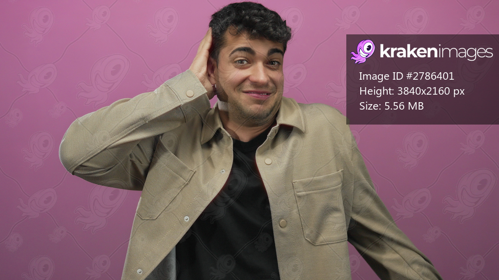 Man holds hand on cheek in studio; confusion doubt skepticism hesitation.