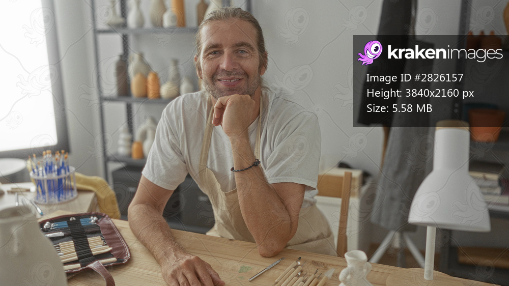 Man holds hand on chin while sitting at a wooden table in a pottery studio with sculpting tools and ceramic vases; creative concentration.