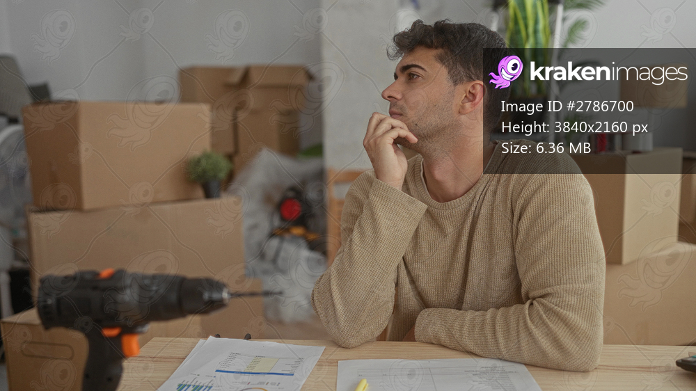 Man holds hand to rest chin in home while young hispanic new boxes guy moving unpacks furniture.