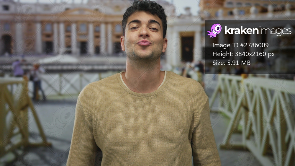 Man holds hands pointing toward vatican as young hispanic guy tourist visits rome sightseeing.