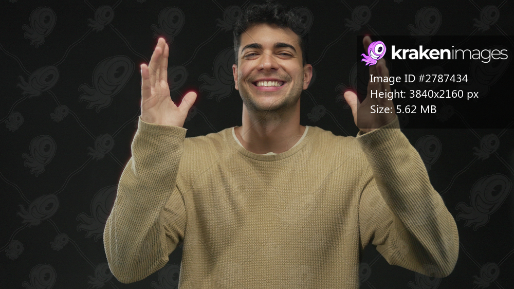 Man holds hands up, raising them against background, with young hispanic male smiling framing black space.