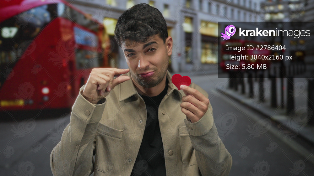 Man holds heart by pinching it with fingers on a busy street where guy hispanic styled in young fashion stands in a neon city full of love this valentine. - Kraken Images