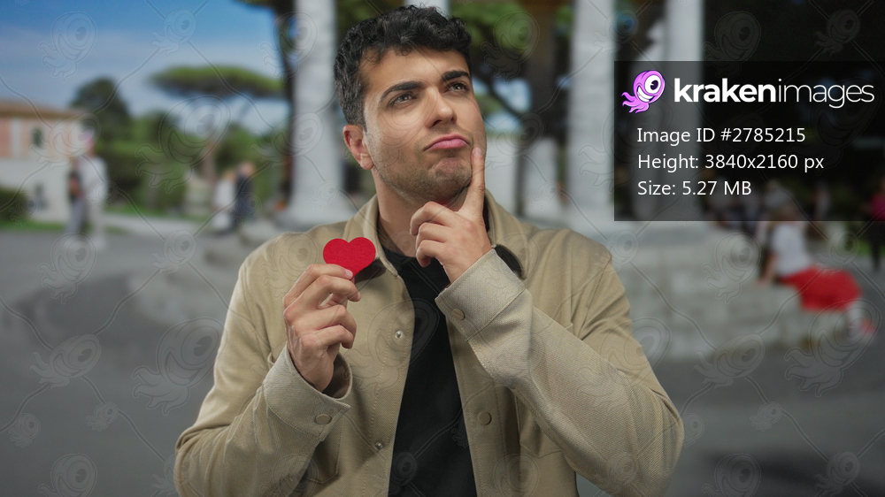 Man holds heart and think about plaza memories while love sparks red paper token by young hispanic travel blogger.