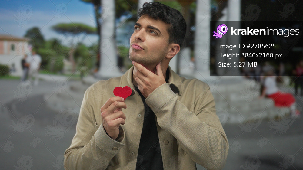 Man holds heart and think about plaza memories while love sparks red paper token by young hispanic travel blogger.