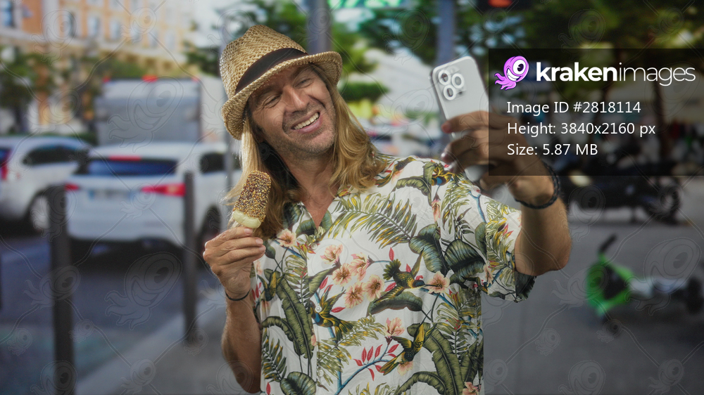 Man holds icecream cone and smartphone for selfie on downtown street market scene in vibrant city; vacation joy.