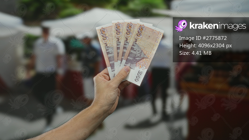 Man holds icelandic krona banknotes in an outdoor market setting, highlighting currency and trade in a vibrant street environment.