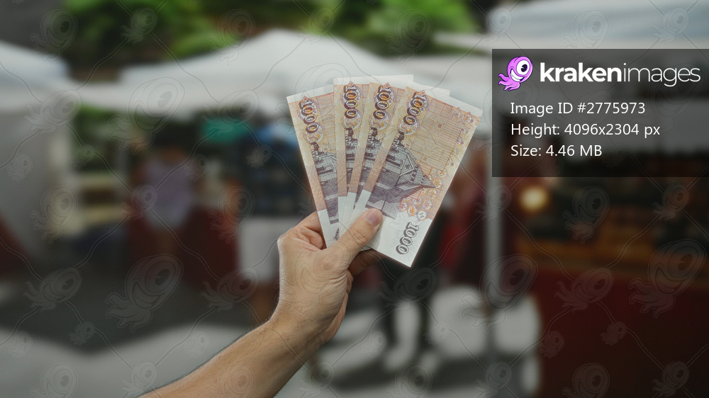 Man holds icelandic krona banknotes in an outdoor market setting, highlighting currency and trade in a vibrant street environment.