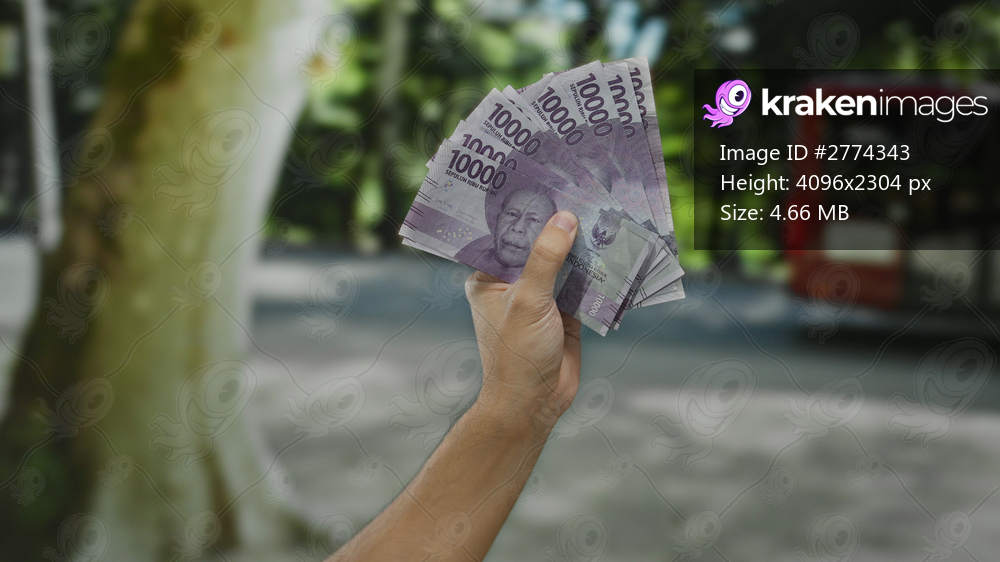 Man holds indonesian rupiah banknotes outdoors on a city street, showcasing currency in a casual urban setting with daylight and a blurred background.