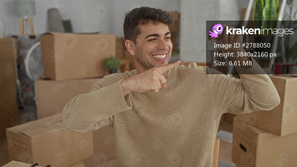 Man holds keys, holding them at home door, greeting guy new hispanic young visitor with boxes smiling.