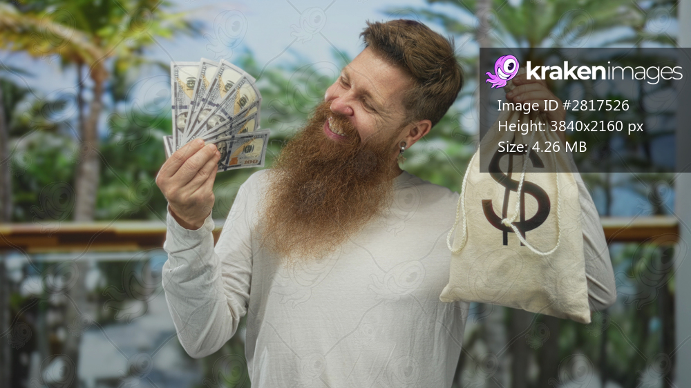 Man holds money bag and fan of cash with bare hands while smiling among palm trees in forest; wealth prosperity happiness.