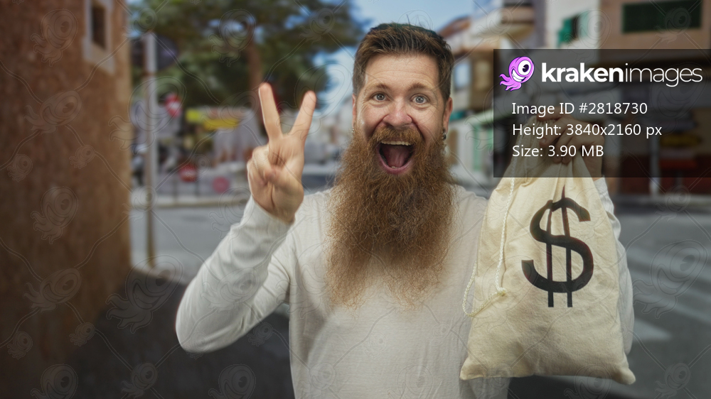 Man holds money bag marked with dollar sign, grinning widely, and makes peace sign on street; pride success celebration.
