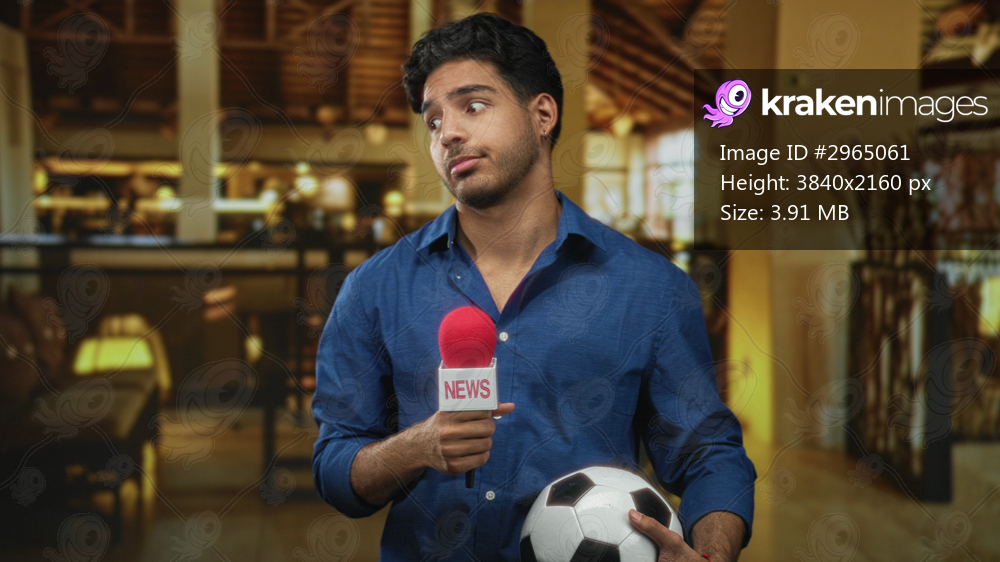 Man holds news microphone and cradles soccer ball while making a hesitant gesture in a building lobby; hesitation reporting.