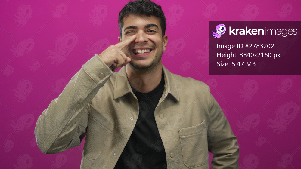 Man holds nose while pointing at background as young hispanic smiling portrait finger guy poses.