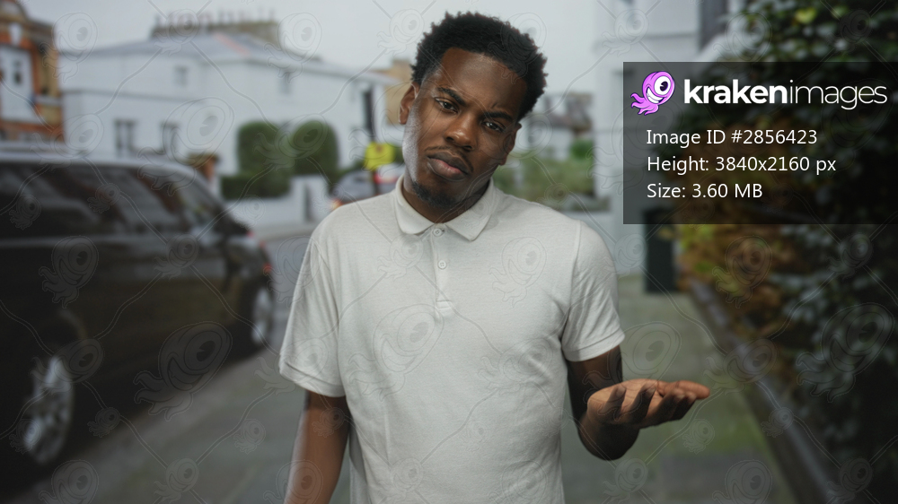 Man holds palms up with puzzled gaze on city street lined with parked vehicles; uncertainty dilemma.