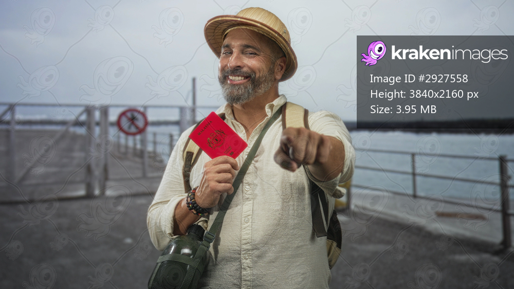 Man holds passport and points finger at camera on a seaside dock pier with backpack and sun hat, smiling and ready to travel; adventure travel confident. - Kraken Images