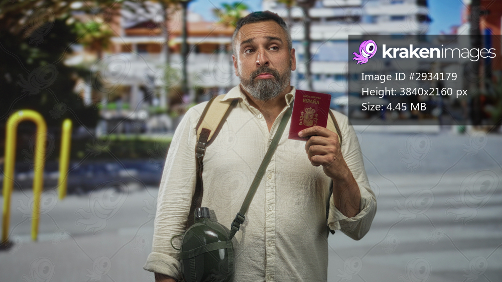 Man holds passport and rests hand on backpack strap while wearing linen shirt and bearded on street; frustration travel delay.