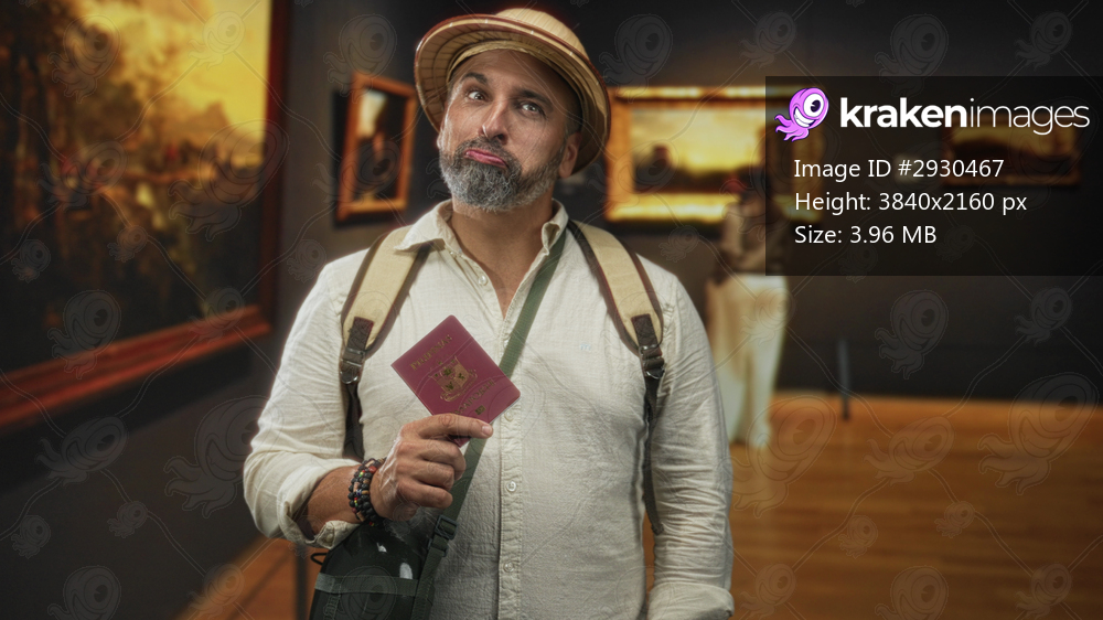 Man holds passport, wears straw hat and backpack, beard visible, standing in art gallery; curiosity travel.