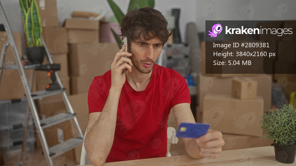 Man holds phone to ear and holds creditcard in hand among moving boxes inside building; financial concern.