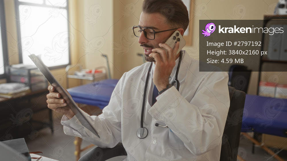 Man holds phone to ear reading clipboard inside building; concentration diligence care professionalism.