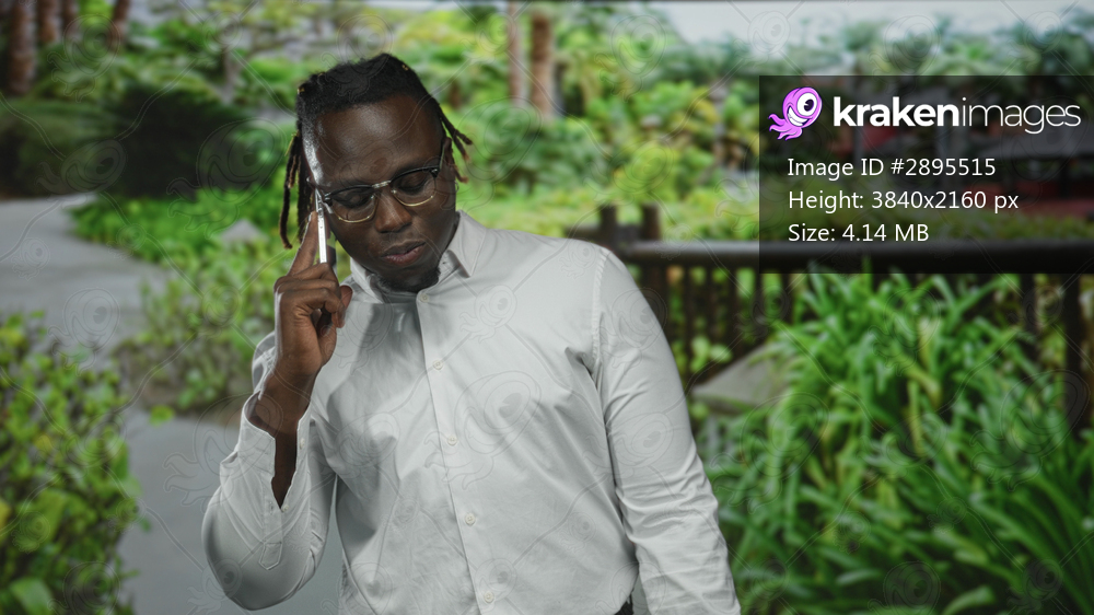 Man holds phone to ear walking on a park path by wooden railing and lush plants; calm contemplation.