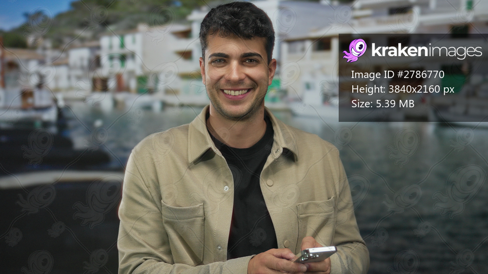 Man holds phone while texting near waterfront where hispanic young traveler admires harbor view as male visitor stands by marina with mobile device.