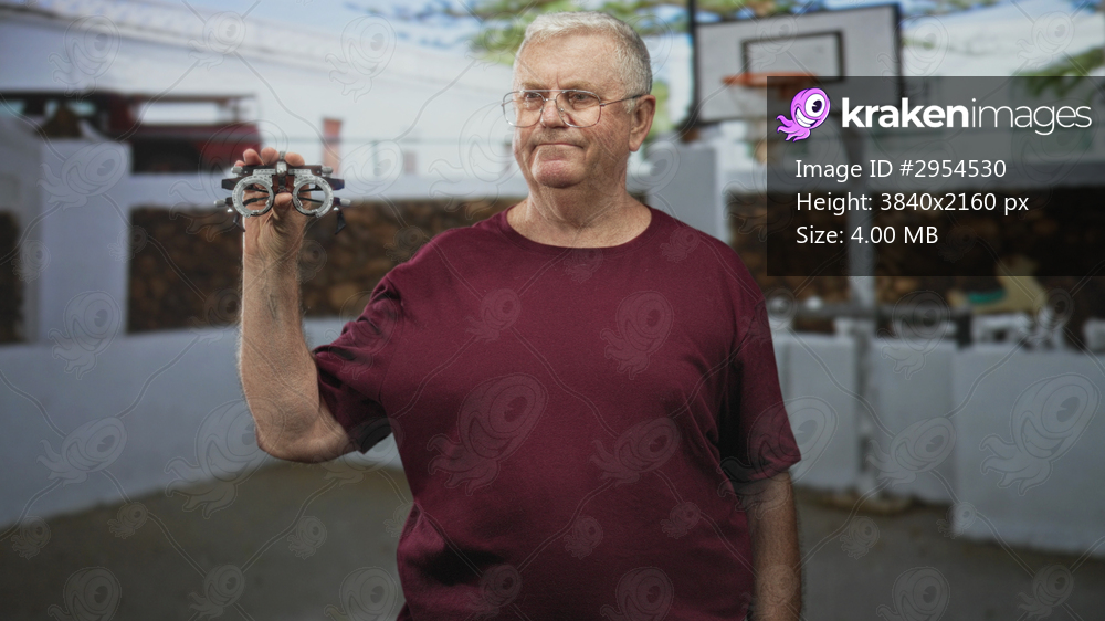 Man holds phoropter with raised hand while wearing eyeglasses and testing posture in front of building; care calm.