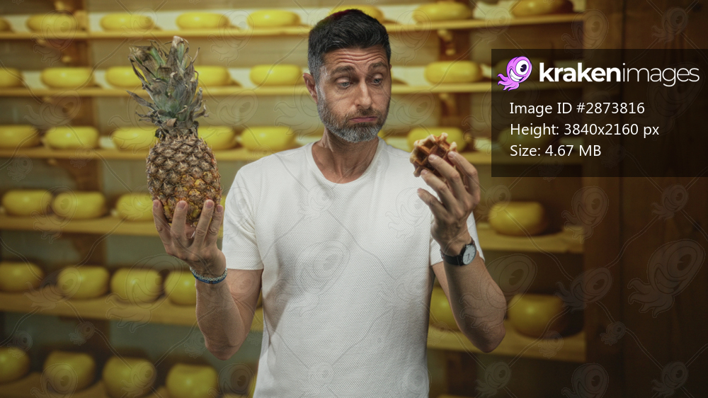 Man holds pineapple in one hand and a waffle in the other while inspecting fruit against shelves of cheese in a shop; food choice indecision.