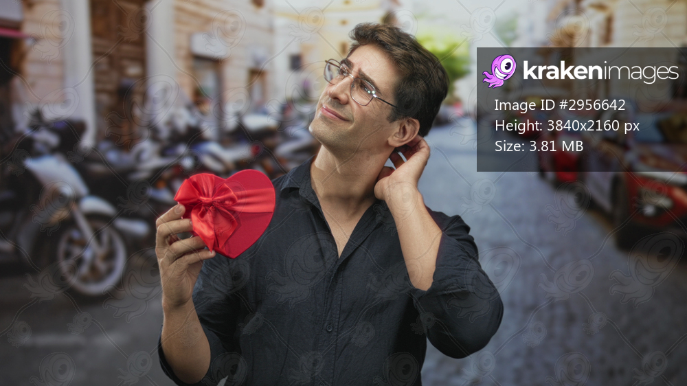 Man holds red heart gift with bow, hand to neck gesture, wearing glasses and dark shirt on a sunlit cobblestone street; longing romance.