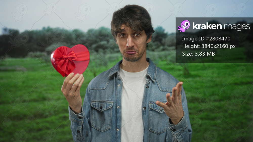 Man holds red heart gift box with palm up gesture in lush green park beside trees and open lawn; hesitant love doubt.
