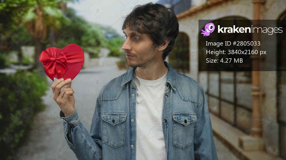Man holds red heart shaped gift box on busy street playfully pointing finger to box; heartbreak despair.