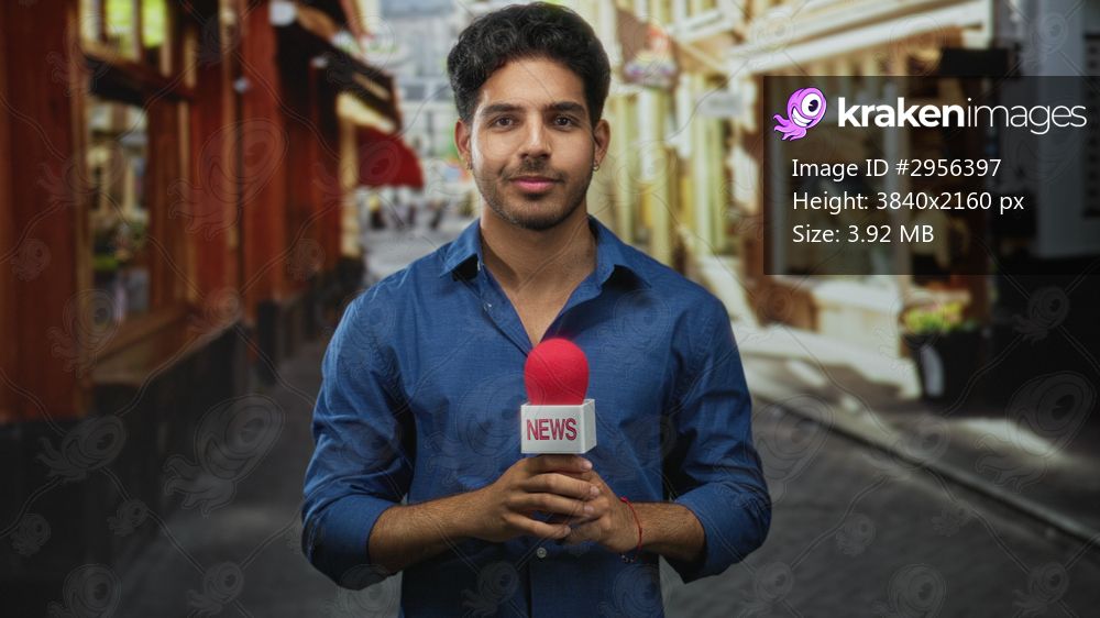 Man holds red microphone with news logo and gestures with hand on street reporting; location confidence.