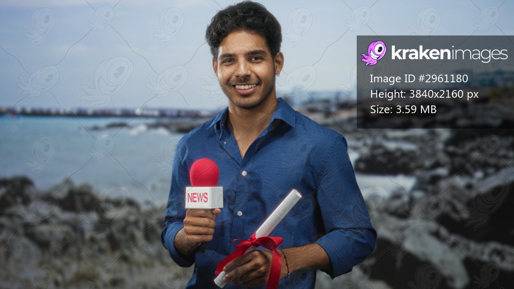 Man holds red microphone and rolled diploma tied with ribbon, hand gripping microphone in a studio set with rocky seaside backdrop; pride celebration.