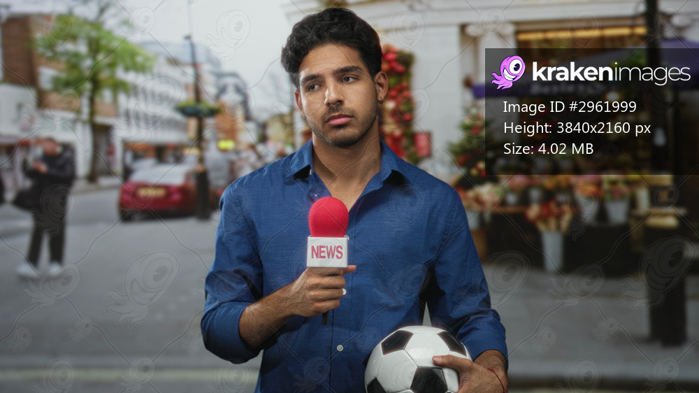 Man holds red news microphone at chest and cradles soccer ball by his side on a busy urban street lined with a flower stall and storefronts; serious reporting. - Kraken Images